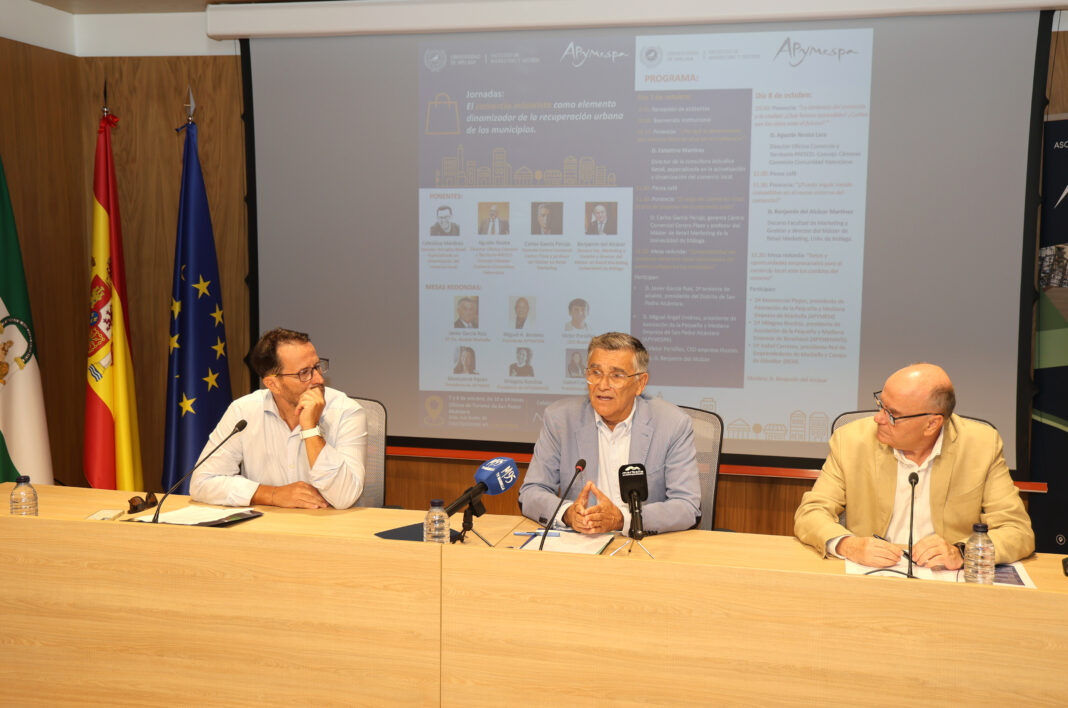 El Ayuntamiento respalda las jornadas sobre el comercio minorista, organizadas por la Asociación de la Pequeña y Mediana Empresa de San Pedro Alcántara (Apymespa) en colaboración con la Universidad de Málaga (UMA) para abordar los desafíos del sector. El teniente de alcalde sampedreño, Javier García, ha asistido, junto al vicepresidente del colectivo, José María Moreno, y el decano de la Facultad de Marketing y Gestión, Benjamín del Alcázar, a la presentación de la cita, que se celebrará los días 7 y 8 de octubre en la Oficina de Turismo de San Pedro. El edil ha destacado la importancia “de seguir fomentando y potenciando estas acciones, muy necesarias no solo para los emprendedores y autónomos, sino para el crecimiento de la ciudad”.