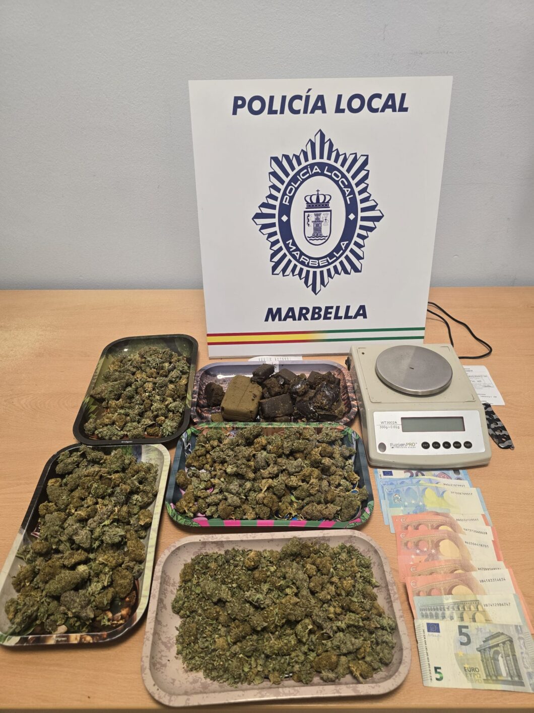 La Policía Local de Marbella ha desmantelado un supuesto club de fumadores ubicado en la avenida Ricardo Soriano que carecía de licencia de apertura y en el que se distribuían sustancias estupefacientes. Los agentes intervinieron un total de 673,8 gramos de marihuana y hachís en una operación en la que fue detenido un individuo de 45 años y nacionalidad polaca sobre el que pesa una orden de búsqueda y detención procedente del Juzgado de Instrucción número 5 de Marbella por un delito de conducción bajo la influencia del alcohol o las drogas.