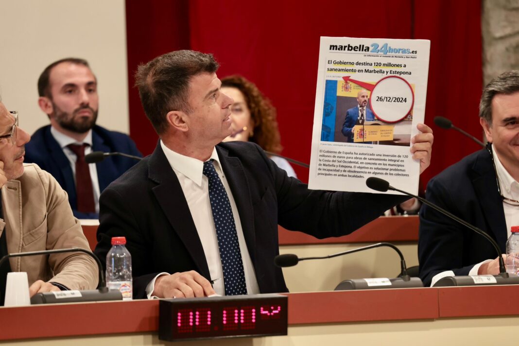 El edil puso el foco en los 120 millones de euros anunciados para actuaciones de saneamiento en Marbella y Estepona, recordando que fueron anunciados el 26 de diciembre de 2024 por el subdelegado del Gobierno en Málaga, Javier Salas, al que definió como el hombre fuerte de Pedro Sánchez en la provincia.