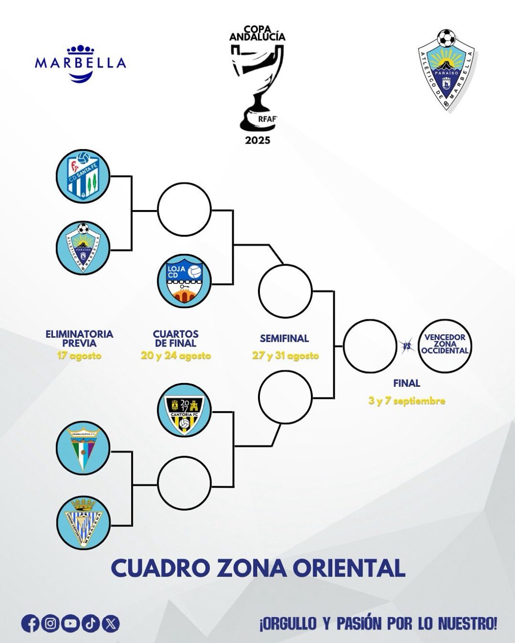 El Atlético Marbella Paraíso ha comenzado más temprano que nunca la pretemporada. Desde el 1 de julio el cuadro de Chechu Rodríguez se encuentra en dinámica de entrenamientos. La intención del cuadro albiceleste pasa por llegar en el mejor estado posible al inicio de la Copa Andalucía que tendrá lugar en torno al 17 de agosto. El cuadro marbellí deberá superar 5 rondas para asegurar su participación en la Copa del Rey. En total, 9 partidos para ganar ritmo de competición y ver a los nuevos fichajes. La primera eliminatoria tendrá lugar ante el Santa Fe. El ganador del duelo se medirá al Loja a ida y vuelta el 20 y 24 de agosto.