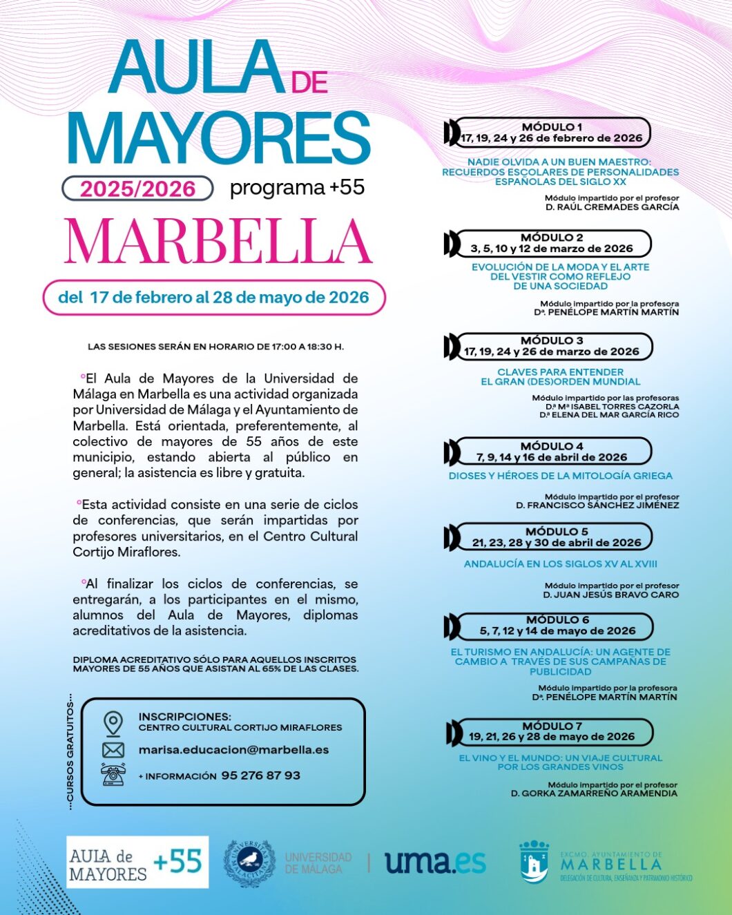El Ayuntamiento y la Universidad de Málaga ponen en marcha una nueva edición del Aula de Mayores en el municipio, un programa que contempla siete acciones formativas que se desarrollarán entre los meses de febrero y mayo en el Centro Cultural Cortijo Miraflores. Se trata de una iniciativa libre y gratuita, orientada preferentemente a laspersonas mayores de 55 años, aunque abierta al público en general. La directora general del ramo, Carmen Díaz, ha señaladoque “es una gran oportunidad tener en Marbella una actividad plenamente consolidada que ofrece estudios universitarios a un colectivo fuera del rango de edad habitual de esta formación y que fomenta el aprendizaje permanente, el pensamiento crítico y la participación cultural de la mano de profesores de primer nivel y con una programación de calidad”.