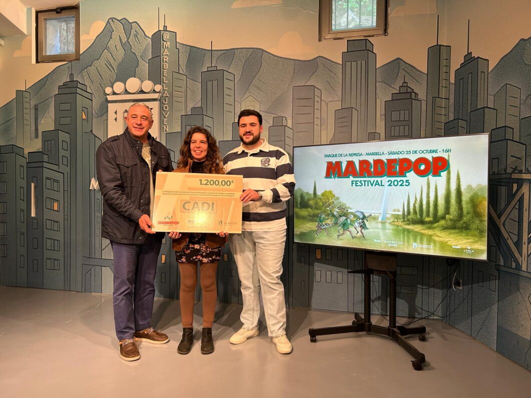 El concejal de Juventud, Alejandro González, ha hecho entrega hoy a la presidenta de la Asociación CADI (Centro de Atención a la Diversidad Infantil), Angie Sánchez, de un cheque de 1.200 euros. Dicha cuantía procede de la recaudación obtenida de los vasos solidarios y reutilizables (ecovasos) puestos a la venta junto a la primera consumición, a un coste de un euro extra, en el Festival Marbepop celebrado el 25 de octubre. El edil ha destacado que se trata de una iniciativa que vamos a seguir manteniendo en el tiempo y que permite ayudar de forma muy sencilla a colectivos locales, al mismo tiempo que se mantiene esa apuesta en materia ecológica dentro de este evento. “La barra del festival la ha gestionado este año la Agrupación Musical Marbella, que colaboró activamente en esta acción benéfica y sostenible, ha indicado González.