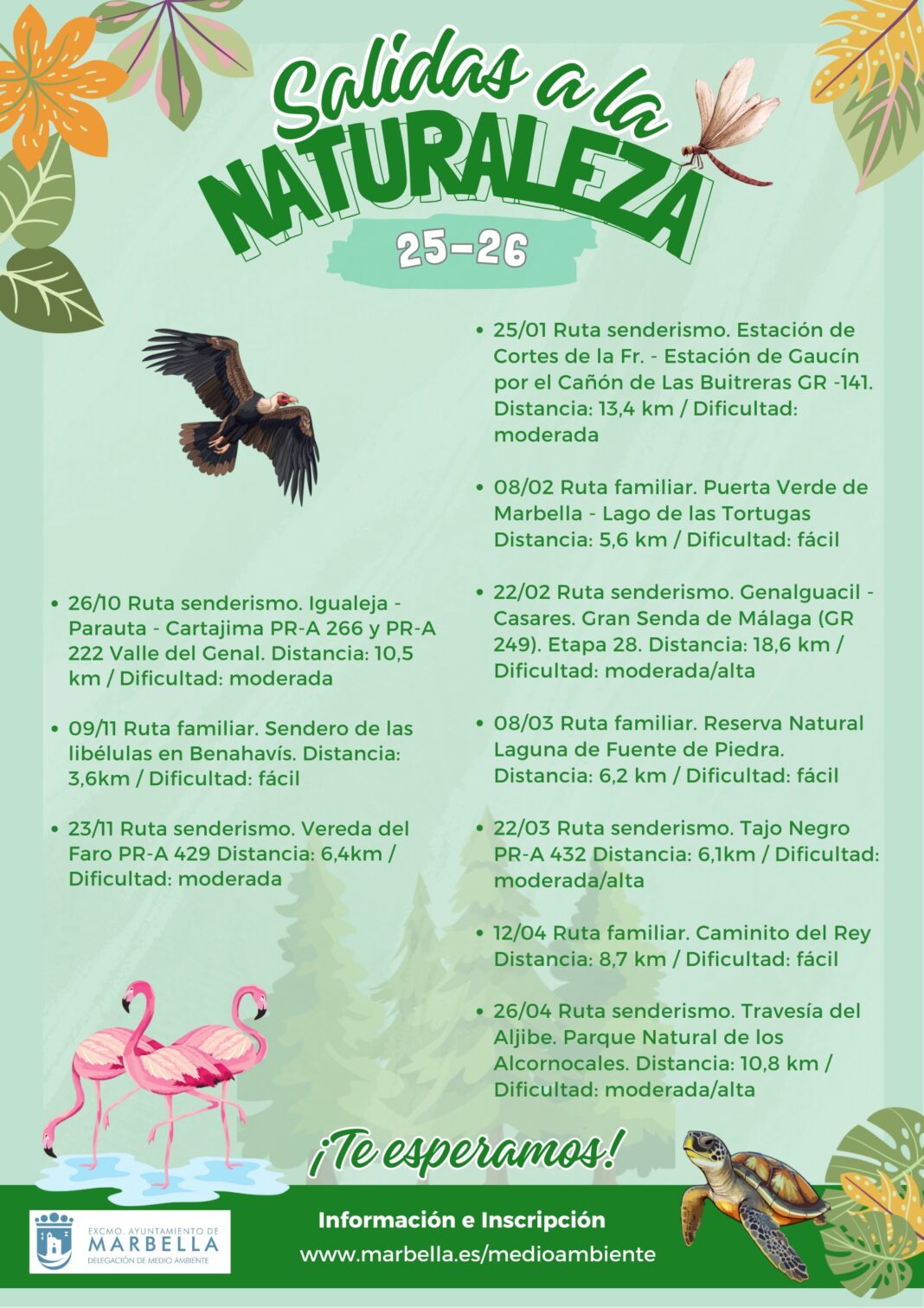 Por su parte, Quesada ha desgranado todas las rutas de la iniciativa, que arrancará el domingo, 26 de octubre, con la excursión ‘Igualeja-Parauta-Cartajima’ (10,5 kilómetros y dificultad moderada), y seguirá el 9 de noviembre con la jornada familiar del ‘Sendero de las libélulas en Benahavís’ (3,6 kilómetros y dificultad fácil). Continuarán el 23 de noviembre con las rutas ‘Vereda del Faro’ (6,4 kilómetros y dificultad moderada); ‘Estación de Cortes de la Frontera-Estación de Gaucín por el Cañón de Las Buitreras’ (25 de enero, 13,4 kilómetros y dificultad moderada); ‘Puerta Verde Marbella-Lago de las Tortugas (8 de febrero, 5,6 kilómetros y dificultad fácil); ‘Genalguacil-Casares. Gran Senda de Málaga. Etapa 28’ (22 de febrero, 18,6 kilómetros y dificultad moderada/alta); ‘Reserva Natural Laguna Fuente de Piedra’ (8 de marzo, 6,2 kilómetros y dificultad fácil; ‘Tajo Negro (22 de marzo, 6,1 kilómetros y dificultad moderada/alta); ‘Caminito del Rey’ -en la que cada participante deberá abonar el coste de la entrada fijado en 10 euros- (12 de abril, 8,7 kilómetros y dificultad fácil), y ‘Travesía del Aljibe. Parque Natural de los Alcornocales’ (26 de abril, 10,8 kilómetros y dificultad moderada/alta). Más información en el siguiente enlace: https://www.marbella.es/web/medio-ambiente/area-de-medio-ambiente/salidas-a-la-naturaleza/programa-salidas-a-la-naturaleza.html.
