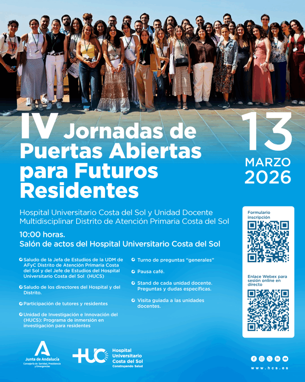 El Hospital Universitario Costa del Sol y el Distrito de Atención Primaria Costa del Sol, pertenecientes al Servicio Andaluz de Salud (SAS) de la Consejería de Sanidad, Presidencia y Emergencias, celebrarán este viernes, 13 de marzo, en el salón de actos del hospital, una jornada de puertas abiertas dirigida a futuros residentes. El objetivo es que conozcan muy de cerca los servicios y unidades del hospital y de los centros de salud del Distrito para que los elijan como lugares para llevar a cabo su formación.
