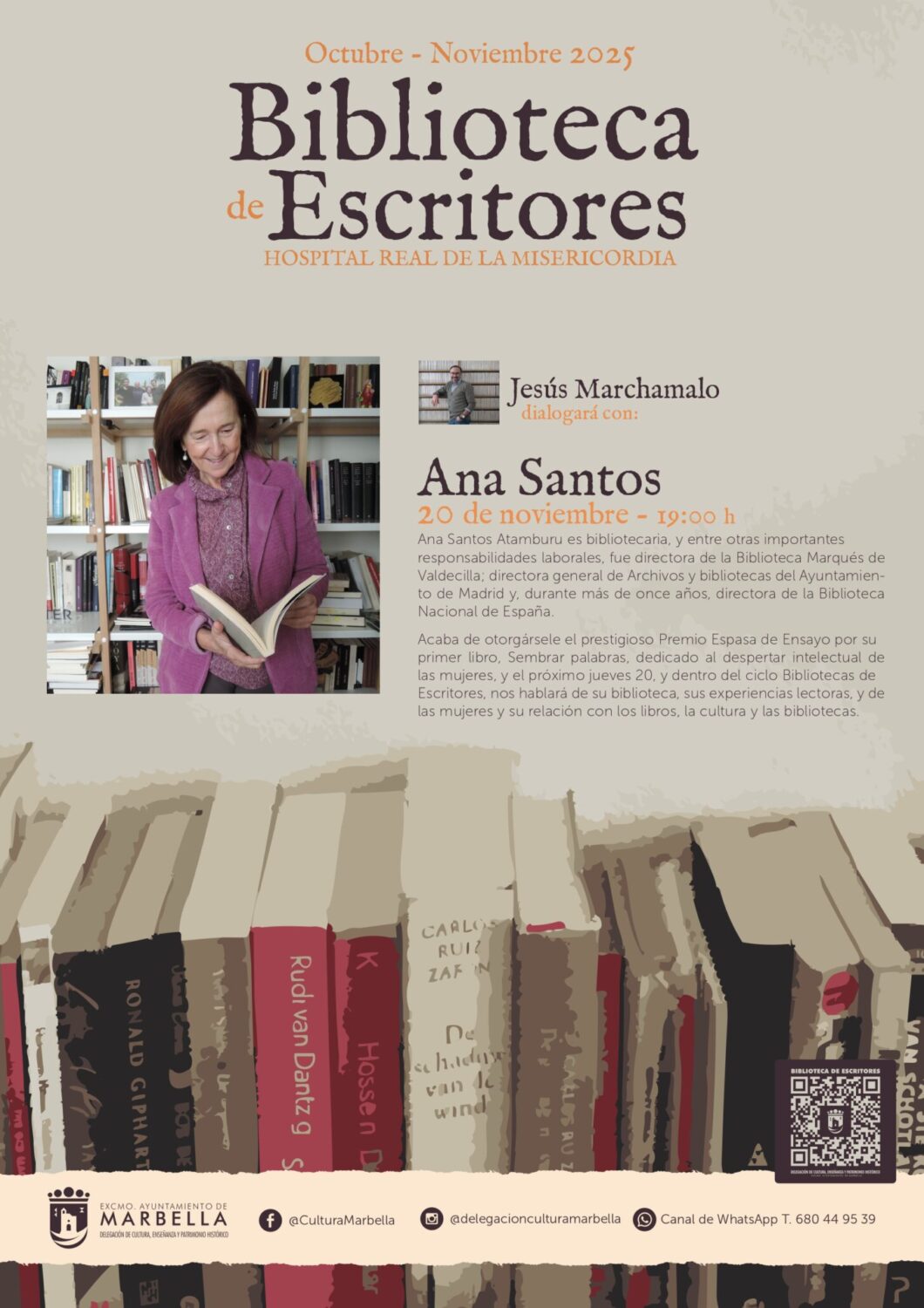 El Hospital Real de la Misericordia albergará mañana jueves, 20 de noviembre, a las 19.00 horas, un encuentro con la bibliotecaria Ana Santos Atamburu, dentro del ciclo ‘Biblioteca de Escritores’, organizado por la delegación municipal de Cultura y que coordina y presenta Jesús Marchamalo desde hace cinco ediciones. La entrada es libre y gratuita hasta completar el aforo. La protagonista de mañana fue directora de la biblioteca Marqués de Valdecilla, directora general de Archivos y bibliotecas del Ayuntamiento de Madrid y, durante más de once años, directora de la Biblioteca Nacional de España, entre otros puestos de responsabilidad.