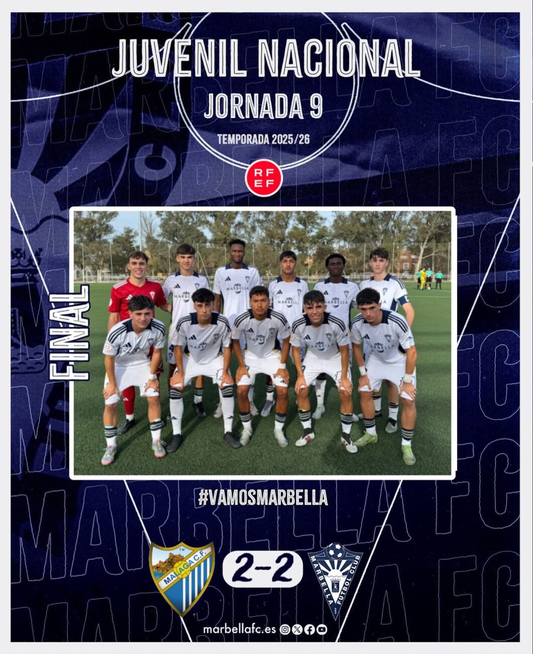 El Juvenil del Marbella sigue protagonizando una gran temporada. Los de Francis Huéscar sacaron un punto de su visita a la capital para medirse ante el filial del Málaga. Los goles, llegaban en la segunda mitad. Diego Revuelta adelantaba a los blancos en el minuto 58, pero la recta final se complicó para los intereses del cuadro marbellí. El filial malaguista hacia el empate en el 79 por medio de Inocencio y en el 87 volvía a poner por delante a los locales Comitre. Sin embargo, dos minutos más tarde igualaba Milco para salvar un punto de la Ciudad Deportiva del Málaga.