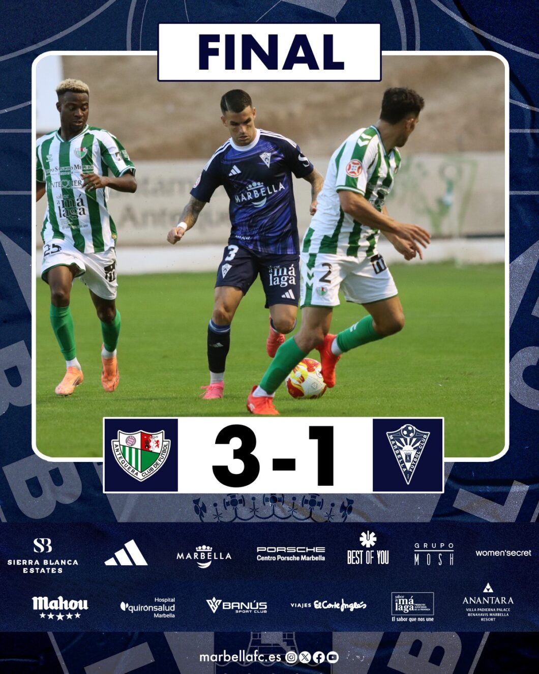 Imagen preocupante de un Marbella que no inició bien el partido y no supo disponer de la regularidad suficiente para hacer frente a un Antequera muy superior. Los tres goles fueron provocados por errores individuales a considerar en la próxima semana de trabajo. La plantilla recibirá al Cartagena el próximo domingo a las 12:00 h en la Dama de Noche para afrontar la octava jornada de liga. Los blancos son undécimos en la tabla con diez puntos y dos de ventaja sobre el descenso.