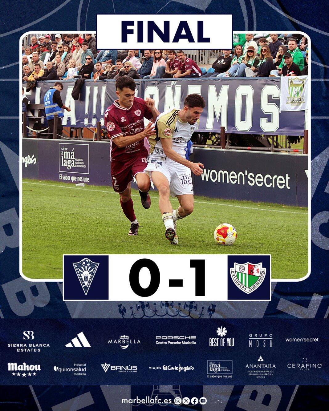 Un golazo de Luismi Gutiérrez decantó el encuentro para el cuadro antequerano. El Marbella no logró darle continuidad al buen hacer mostrado en Sevilla ante el Betis Deportivo. De más a menos, los de David Cabello firmaron una derrota dolorosa en la Dama de Noche ante una oportunidad idónea de recortar puntos con la salvación. La distancia para salir del descenso la marcará esta tarde la UD Ibiza en el duelo pendiente ante el Atlético Madrileño.