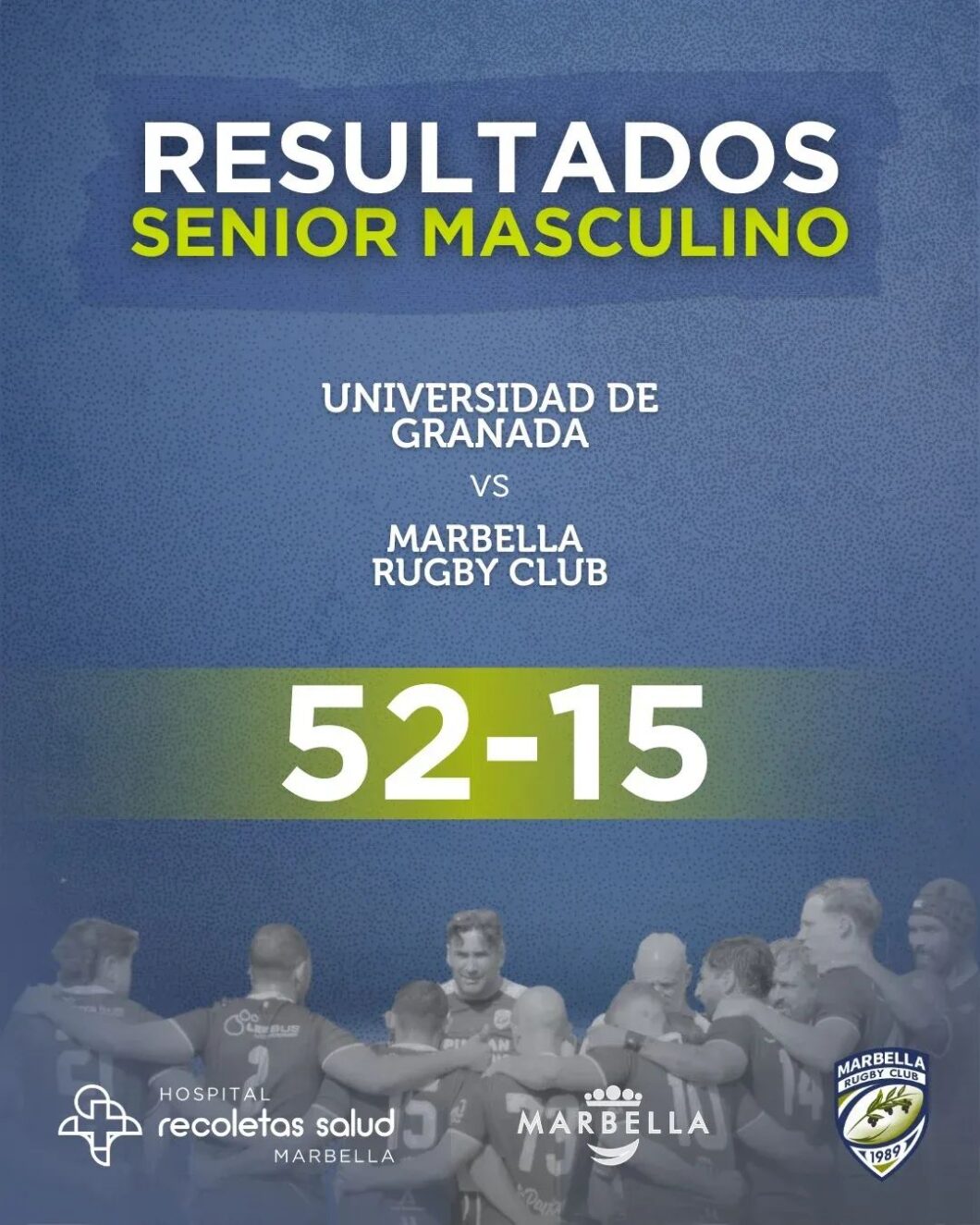 52-15. Diferencia clara en la anotación ante el cuadro granadino que se mostró superior en el duelo. Por parte de Marbella, tan solo pudieron anotar dos ensayos (Jesús Lozano y Mario Santos), además de la transformación de Nahuel Moyano y el punto de castigo de Hugo Valero.