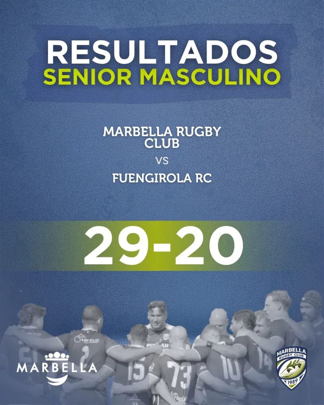 Nuevo triunfo en el Roberto Osborne. El Marbella Rugby Club está protagonizando un gran inicio de liga en la primera regional andaluza. Los de Walter Kleinshuster superaron a Fuengirola en casa por 29-20 y ya le sacan 5 puntos al segundo clasificado. Gran encuentro del marbellí Nacho Molina y Lucas Giordano. Este fin de semana tienen descanso en el calendario y volverán la próxima semana recibiendo a Unión Rugby de Almería en casa.