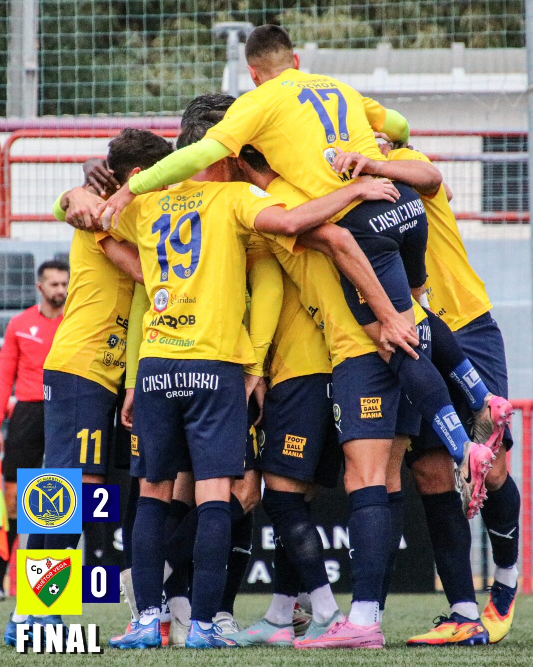 Cierre del año con victoria para el cuadro amarillo. El FC Marbellí volvió a imponerse en el Antonio Naranjo ante el Huétor Vega con Santi Calderón y Andrés Ramos en el banquillo de forma provisional. El equipo suma 22 puntos y se queda a 3 de la quinta plaza. Gato y Jesús Mena anotaron los goles del triunfo amarillo. Es la primera vez que el Marbellí gana un partido por diferencia de dos goles.