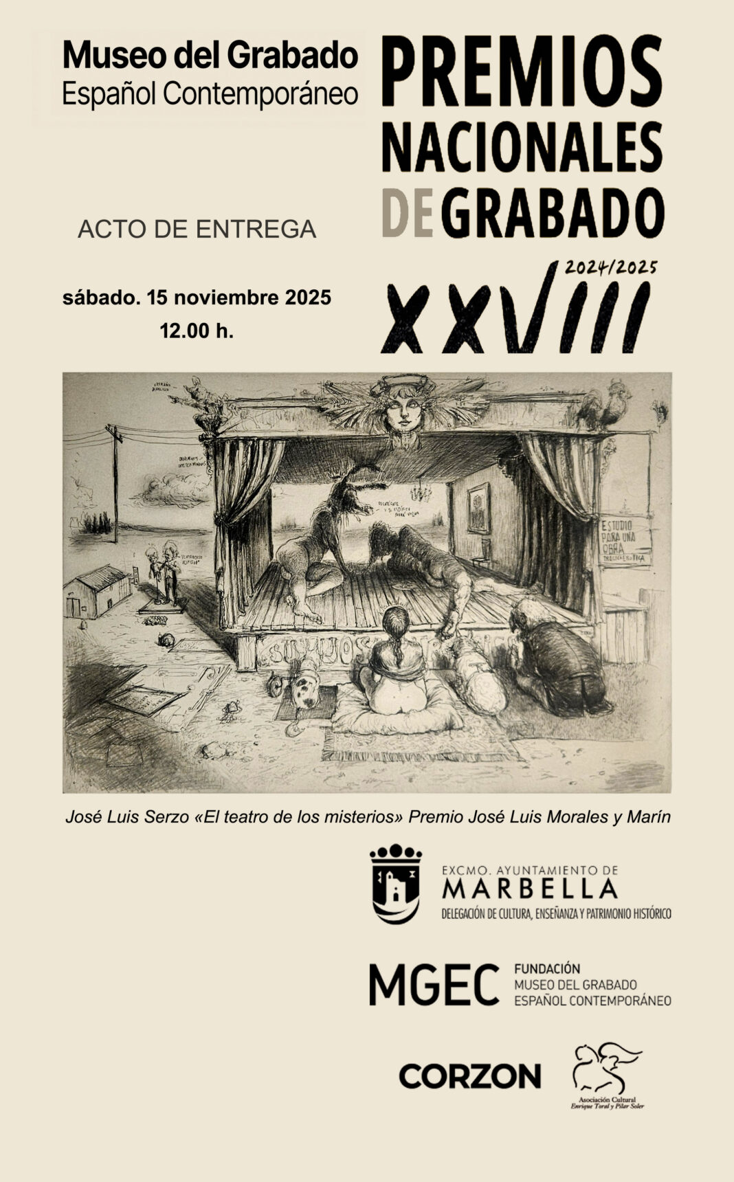 El Museo del Grabado Español Contemporáneo albergará el próximo sábado, día 15 de noviembre, a las 12.00 horas, el acto de entrega de los XXVIII Premios Nacionales de Grabado, que han recaído en los artistas José Luis Serzo, Javier Roz, Inocente Soto y Javier Abad, en el marco de una convocatoria a la que se han presentado más de 200 obras. El pasado 8 de noviembre se decidieron los galardones del concurso, de acuerdo con las bases de la convocatoria, por parte de los miembros del jurado, presidido por María Jesús Martínez Silvente, patrona de la Fundación Museo del Grabado Español Contemporáneo (MGEC) y profesora titular de Historia del Arte en la Universidad de Málaga. El resto de los integrantes han sido José María Luna Aguilar, patrono de la Fundación MGEC y director de Actividades Culturales Fundación Bancaria Unicaja; Juan Francisco Rueda, crítico de Arte y Profesor Titular de Historia del Arte en la Universidad de Málaga, y, actuando como secretario con voz pero sin voto,Germán Borrachero, director del Museo del equipamiento cultural.