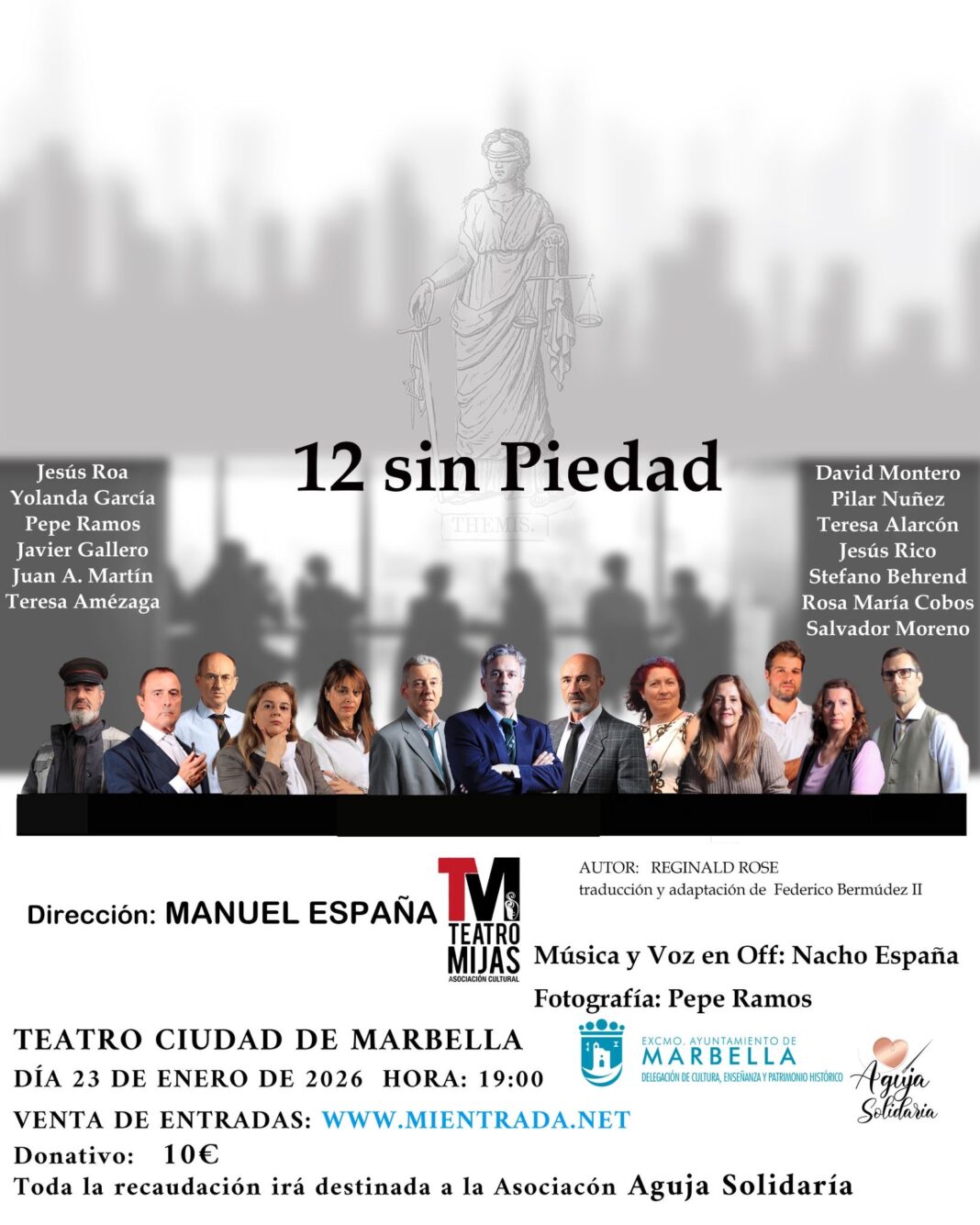 El Teatro Ciudad de Marbella albergará a las 19.00 horas de hoy viernes, día 23 de enero, la representación de la obra ’12 sin Piedad’, una función solidaria a beneficio de la Asociación Aguja Solidaria. Escrita por Reginald Rose y adaptada al castellano por Federico Bermúdez II, plantea un intenso debate moral y social a través de la deliberación de un jurado popular, invitando al espectador a reflexionar sobre la justicia, los prejuicios y la responsabilidad individual. La puesta en escena corre a cargo de Teatro Mijas, bajo la dirección de Manuel España, con música y voz en off de Nacho España y fotografía de Pepe Ramos. El reparto está formado por un amplio elenco de actores y actrices que dan vida a los doce miembros del jurado.
