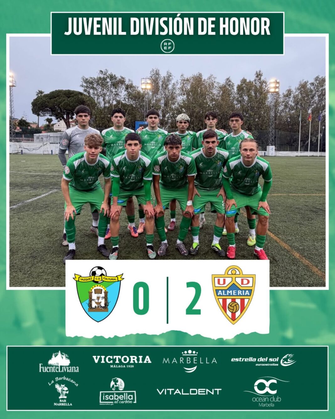 14 puntos de distancia con la salvación a falta de 9 jornadas. El juvenil del Vázquez Cultural cayó ayer derrotado en la jornada inter semanal que se ha celebrado este miércoles en el Grupo IV. Derrota 0-2 ante la UD Almería que deja a los verdes en una situación muy delicada. Están destinados a bajar de categoría y volver a Liga Nacional. Este domingo visitarán a las cinco de la tarde el campo de la UD Maracena.