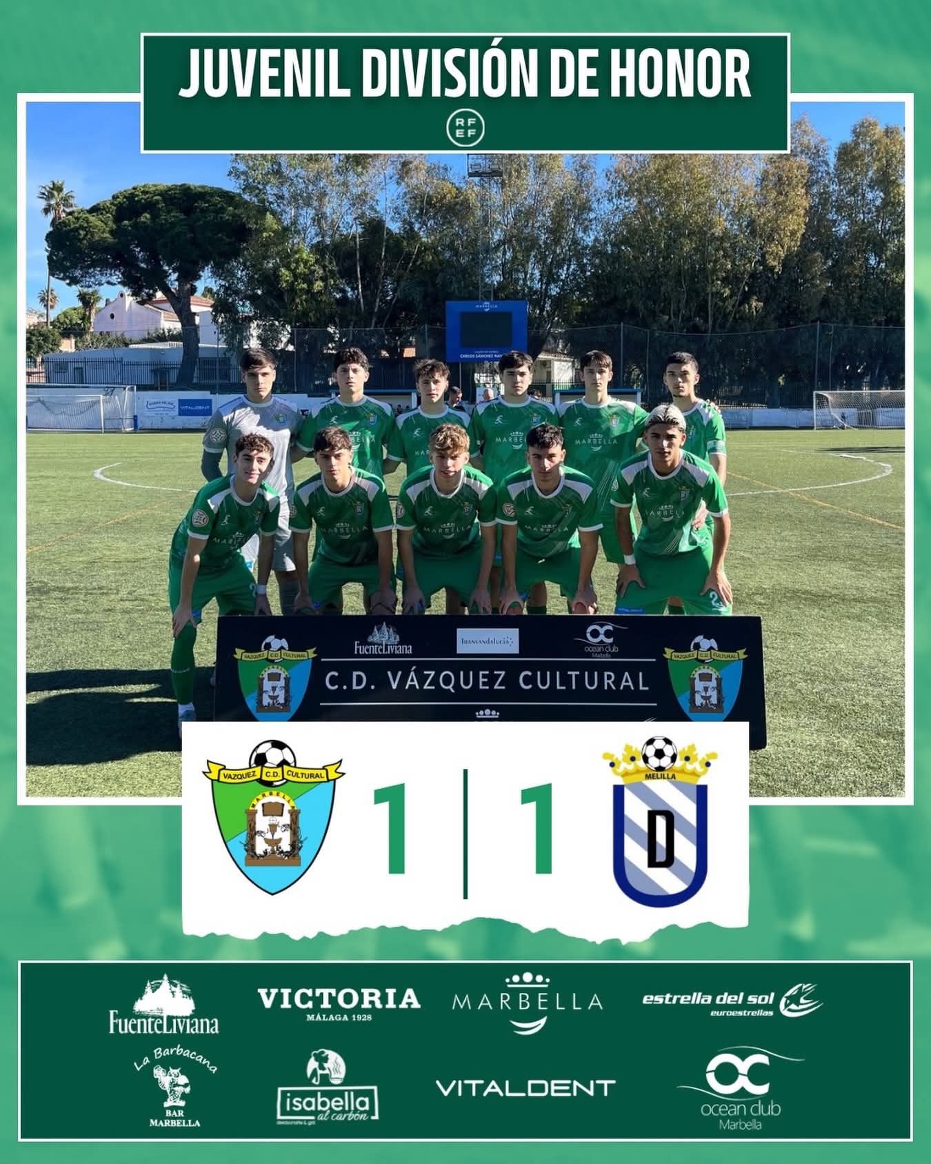 (1-1). El Vázquez Cultural empató en casa ante la visita al Carlos Sánchez de la UD Melilla. Los verdes anotaron por parte de Raúl Esteban, gol insuficiente para sumar los tres puntos.