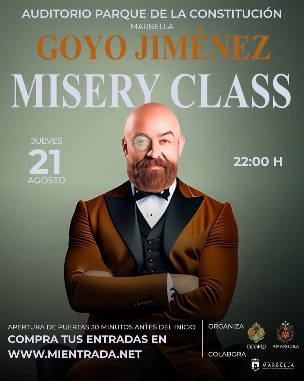 Goyo Jiménez, conocido por su inconfundible estilo, sarcasmo y agudeza, vuelve a los escenarios con «Misery Class», un espectáculo que repasa con humor crítico los temas más actuales de nuestra sociedad desde la mirada de una “persona” y no de un “personaje”, como él mismo describe. Una función para reír, reflexionar y disfrutar de una noche diferente en Marbella.