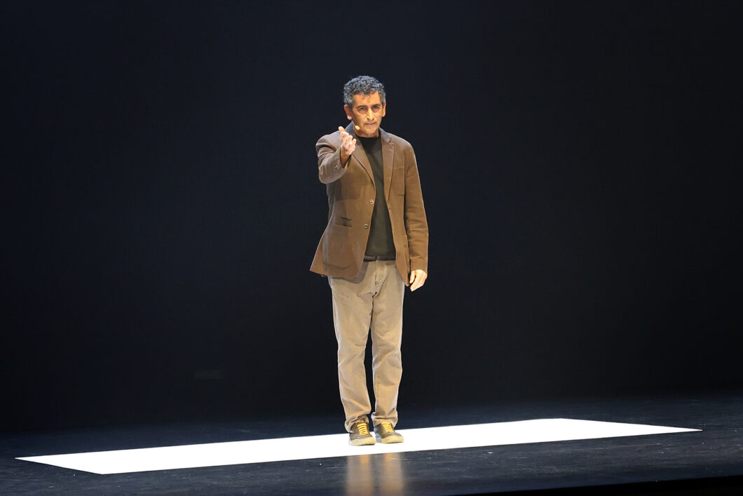 “Me siento intruso por partida doble. Estoy en un festival de poesía y no soy poeta. Tampoco soy actor”, reconoció el dramaturgo tras asegurar que ni él mismo se hubiese imaginado subir al escenario hace unos años. “Como Alberto no podía hacerlo, dije: bueno, lo leo yo. Y ya que lo leía dije: bueno, me aprendo un trozo. Así, poco a poco, fui aprendiéndomelo”, contó durante una conversación posterior a la obra junto al periodista Antonio Lucas. Es la segunda vez que Juan Mayorga interpreta este texto tras estrenarse, en enero de este año, en el Teatro del Barrio de Madrid. Lo hace con una escenografía simple, un cuadrado blanco en el suelo y una silla. Solo eso, su voz y sus gestos dirigidos por la coreógrafa Luz Arcas. “Yo no me atrevería a hacer ‘Hamlet’ ni ‘La vida es sueño’ pero esto, dado que tiene algo que ver con mi propia intimidad en conmoción, me atrevo a compartirlo con la gente”.