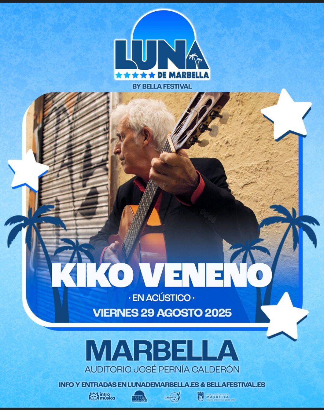 El músico Kiko Veneno ofrecerá un concierto este viernes, 29 de agosto, a las 22.00 horas, en el auditorio José Pernía Calderón, ubicado en el Parque de la Constitución, en el marco del Festival Luna de Marbella. El evento reunirá a uno de los artistas más influyentes de las últimas décadas en el panorama musical nacional, cuya trayectoria ha sido clave en la fusión del flamenco con otros géneros contemporáneos.