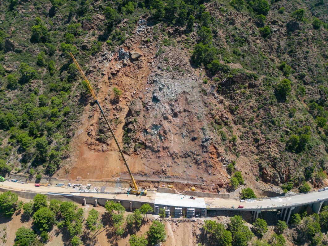 Para reconstruir la carretera ha sido necesario antes ejecutar medidas para garantizar la estabilidad del talud, retirando todas las rocas inestables con maquinaria pesada, medios manuales con especialistas en trabajos verticales y, en último lugar, micro voladuras controladas. Asimismo, se han instalado membranas de contención en las zonas de cabecera e intermedia del deslizamiento y una pantalla dinámica.