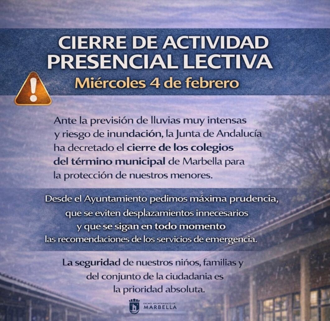 La Junta ha suspendido las clases en Marbella por el temporal este miércoles. De hecho, a excepción de Almería, todos los centros educativos de Andalucía permanecerán cerrados ante las graves previsiones meteorológicas. Y es que debido a la borrasca Leonardo, la Aemet ha activado aviso naranja y rojo por fuertes precipitaciones en toda la comunidad. Así lo ha anunciado el presidente andaluz, Juan Manuel Moreno, tras presidir la reunión del comité asesor del plan territorial de Emergencias.