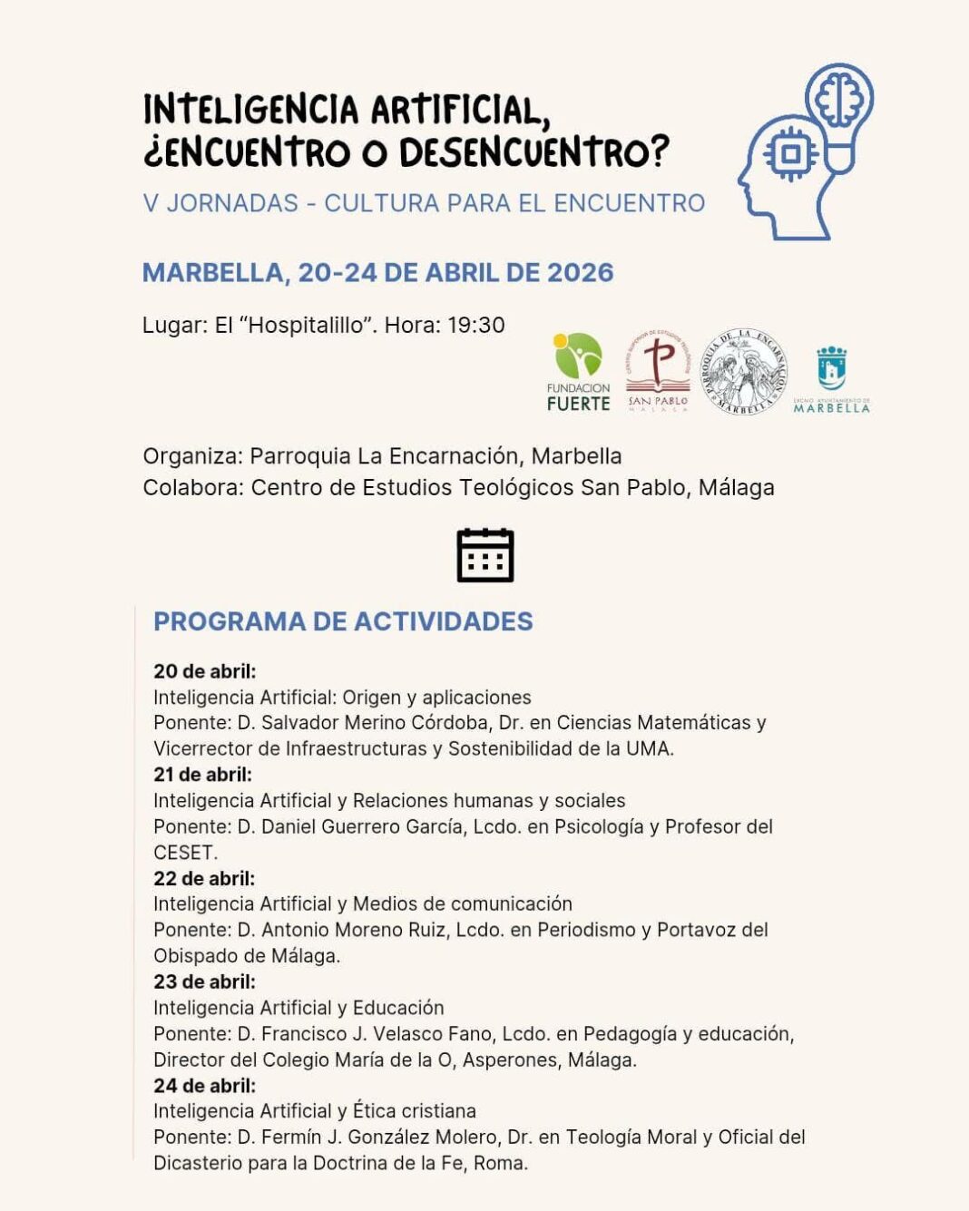 Entre el 20 y el 24 de abril La Parroquia La Encarnación celebrará la V edición de sus Jornadas Culturales para el Encuentro. En este caso, se trata de unos talleres que llevan por título ‘Inteligencia Artificial, ¿Encuentro o Desencuentro?’ que tendrán lugar en el Hospitalillo a partir de las 19.30 horas.