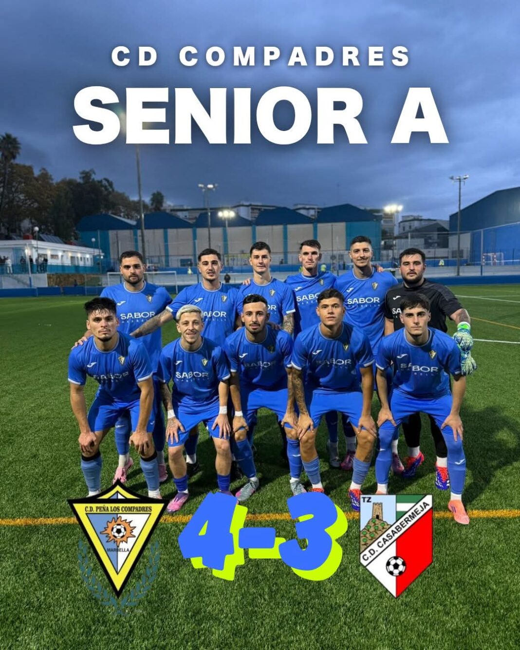 La Peña Los Compadres obró este pasado sábado en el Jesús Cortés Pori el séptimo triunfo consecutivo en liga. El cuadro marbellí tan solo ha caído en dos ocasiones de los diez partidos consumidos en el calendario y mantienen el liderato con tres puntos de ventaja sobre el segundo clasificado y seis sobre el cuarto. En este grupo, ascienden los tres primeros de forma directa.