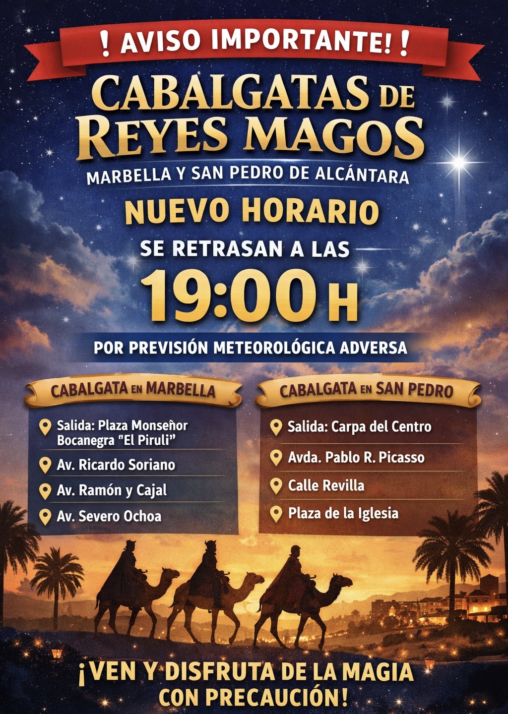 Marbella, 5 de enero de 2026 – El Ayuntamiento de Marbella ha anunciado este lunes tras la reunión del Centro de Coordinación Operativo Local (CECOPAL) que las tradicionales Cabalgatas de los Reyes Magos en Marbella y San Pedro de Alcántara modificarán su horario de inicio, y se celebrarán finalmente a las 19:00 horas, frente al horario inicialmente previsto de las 18:00. Esta decisión se ha adoptado ante las previsiones meteorológicas adversas para la tarde de hoy, con el objetivo de garantizar la seguridad de los asistentes, especialmente de los niños y las familias participantes.