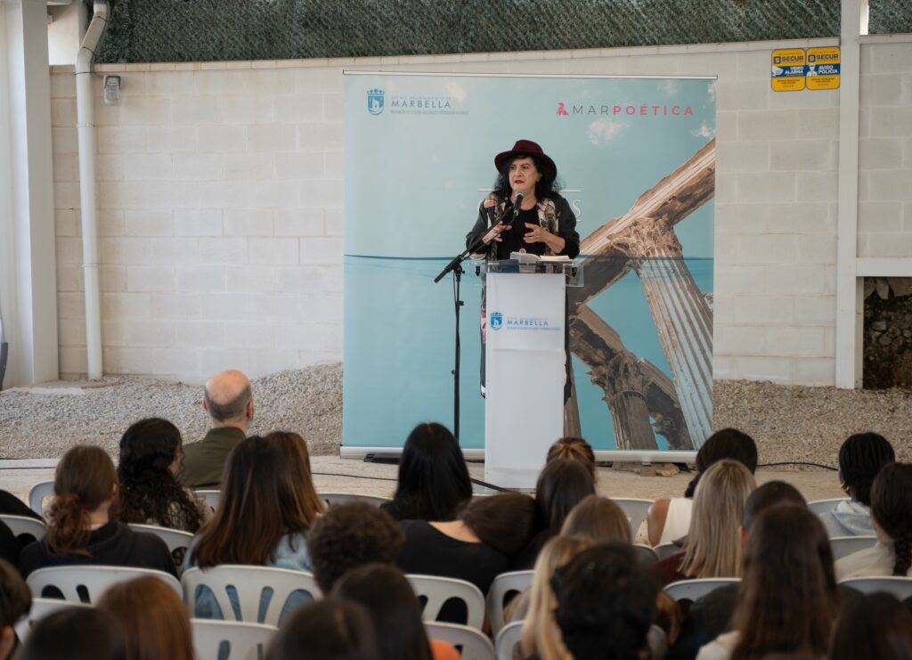 Los estudiantes son protagonistas en Marpoética. El festival de poesía de Marbella cuenta con una serie de propuestas destinadas a la participación activa de los jóvenes lectores. ‘Poesía simultánea’, ‘Visitando a los clásicos’ y ‘Palabra del mar’ aglutinan las actividades destinadas a los institutos que se completan con el Premio de Poesía Escolar dirigido a alumnos de Infantil y Primaria. Este lunes, la Premio Nacional de Poesía, y doctora en Filología Clásica, Aurora Luque se ha reunido con más de 70 alumnos de Humanidades para recitar textos de la antigüedad grecolatina en la Villa romana de Río Verde. Durante el encuentro, los alumnos de los I.E.S. Sierra Blanca, Guadalpín, Río Verde y Victoria Kent han dado voz a Virgilio, Teognis, Safo o Catulo en latín y en griego, con sus correspondientes traducciones para dar paso a las reflexiones de Luque, que ha subrayado la importancia de conocer a los clásicos porque “nos pueden enseñar muchas cosas desde el momento en que todo lo que escriben, todo el arte y todo su legado están construidos sobre un inmenso amor a la vida y amor al ser humano”.