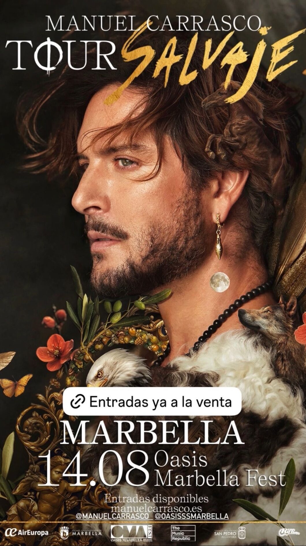 La música, la emoción y la energía de uno de los artistas más queridos del panorama nacional volverán a llenar Marbella este verano. El próximo 14 de agosto, Manuel Carrasco desembarca en la ciudad con su esperado Tour Salvaje, en el marco del Oasis Marbella Fest, y lo hace con un espectáculo que promete ser apoteósico, emocionante y multitudinario.