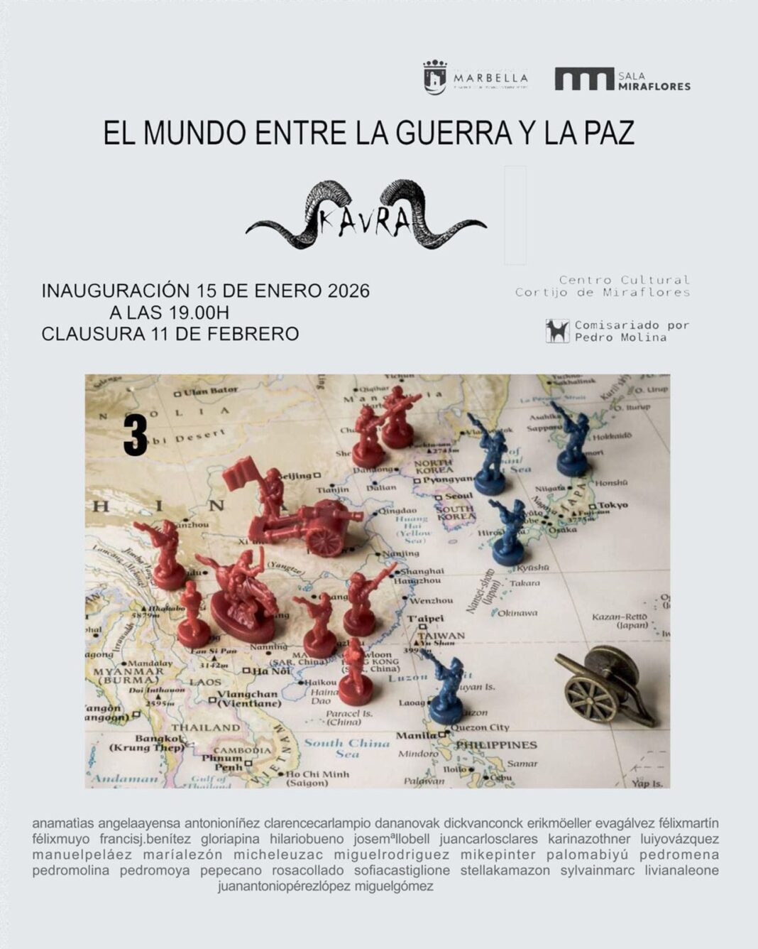 Ese mismo día, a las 19.00 horas y en el mismo espacio cultural, tendrá lugar la inauguración de la exposición internacional El mundo entre la guerra y la paz’, que reúne obras de 35 artistas de distintas nacionalidades y que propone un diálogo visual sobre los conflictos actuales, la resistencia y la libertad de expresión. La muestra, que podrá visitarse hasta el próximo 11 de febrero, reflexiona sobre la dualidad entre la crudeza de los conflictos armados y los procesos de paz, trasladando al ámbito internacional el compromiso social y cultural del colectivo organizador.